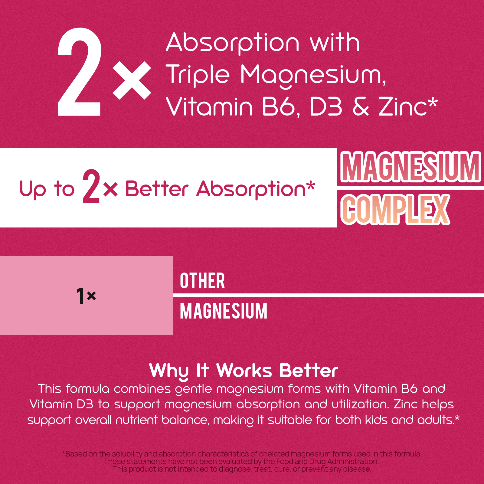 This Triple-Form Magnesium Gummies formula delivers balanced daily mineral support with magnesium glycinate, magnesium malate, and magnesium citrate—enhanced with calcium, vitamin D3, vitamin B6, zinc, and L-theanine for gentle, family-friendly wellness support.