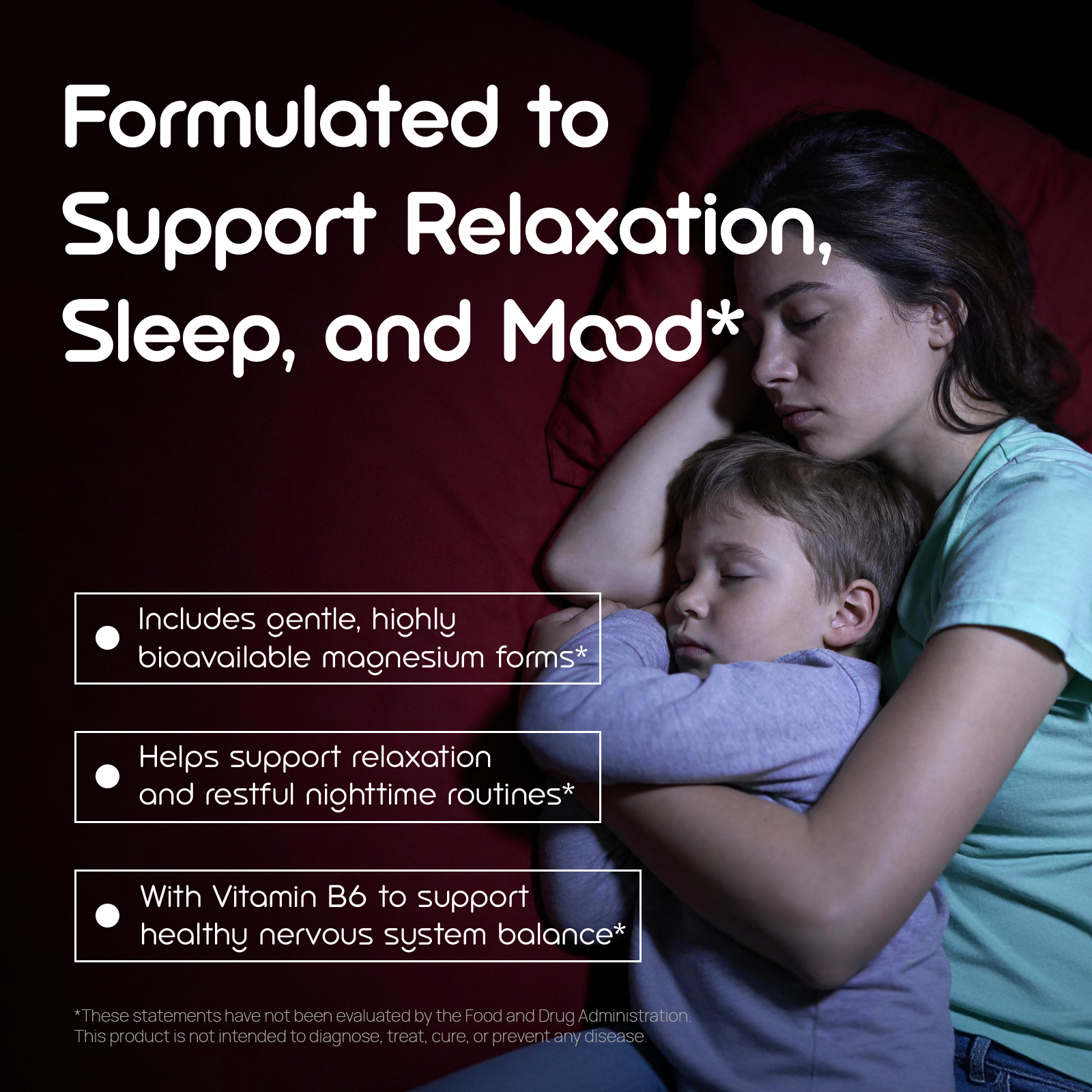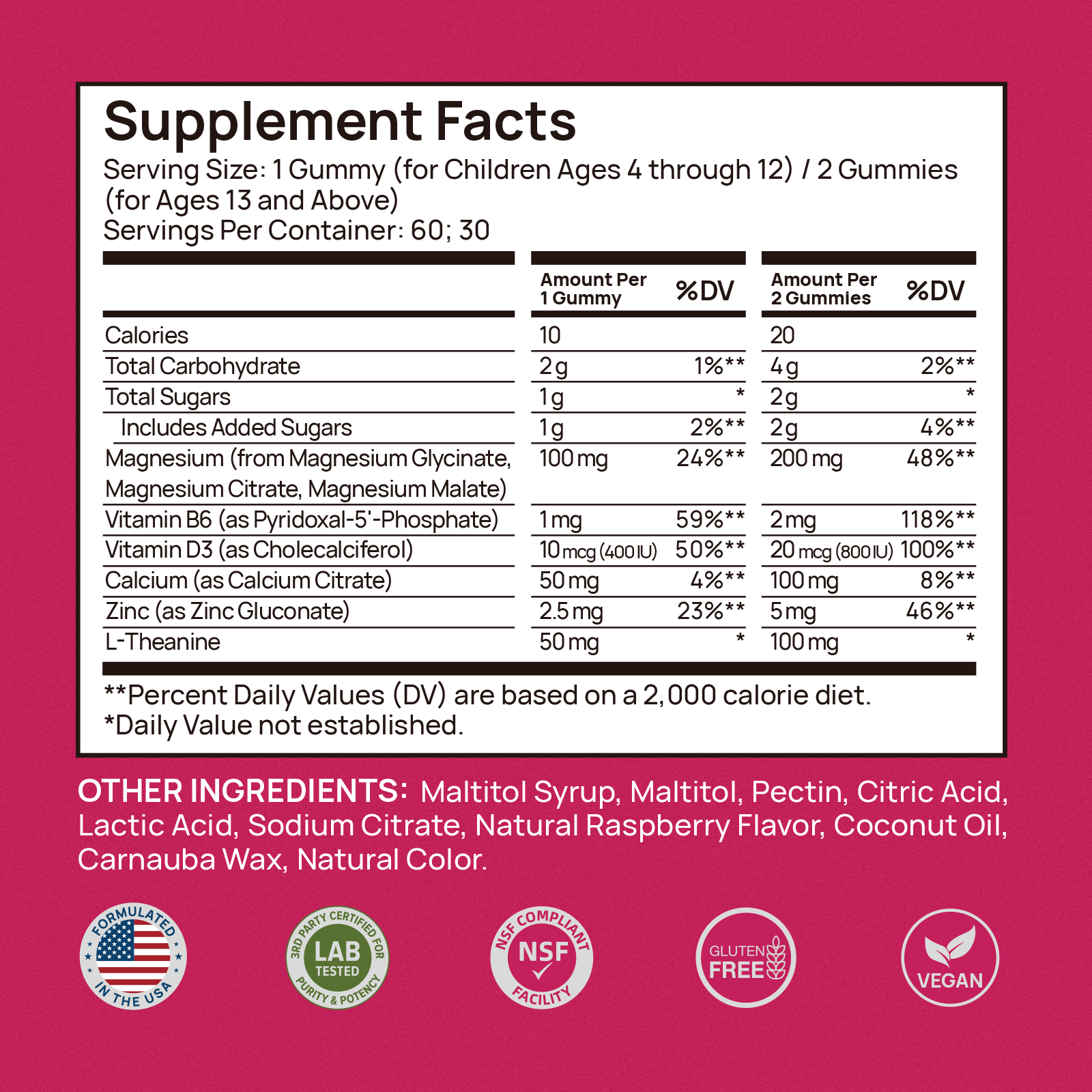 This magnesium glycinate gummies formula combines magnesium glycinate, magnesium malate, and magnesium citrate with essential cofactors including calcium, vitamin D3, vitamin B6, zinc, and L-theanine—designed to support mineral utilization, bone development, nervous system balance, and gentle relaxation while remaining easy on digestion. Melatonin-free and thoughtfully formulated for both kids and adults, it offers steady, everyday support in a soft, raspberry-flavored gummy format.