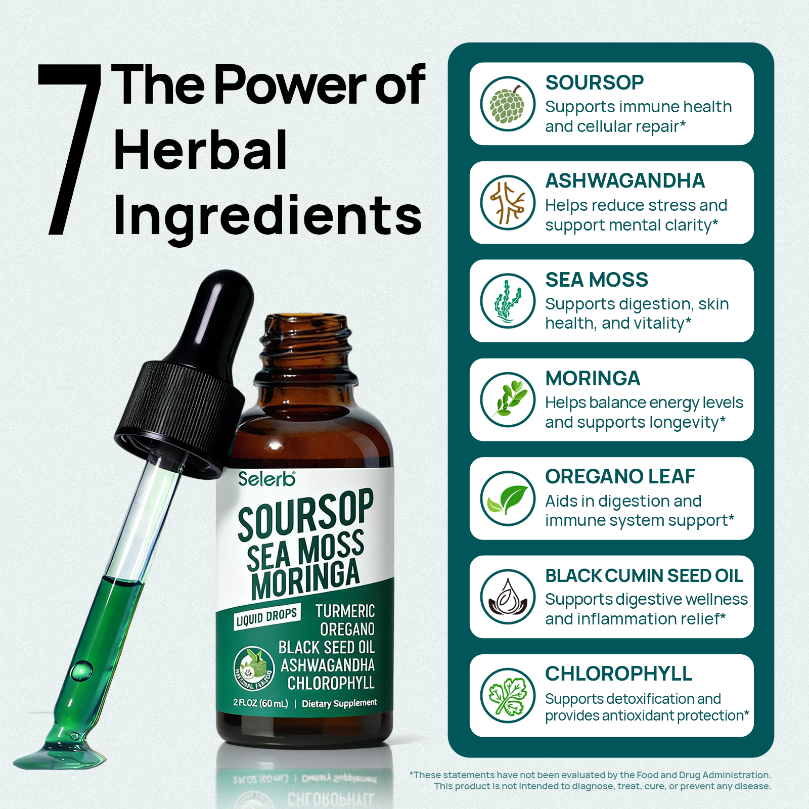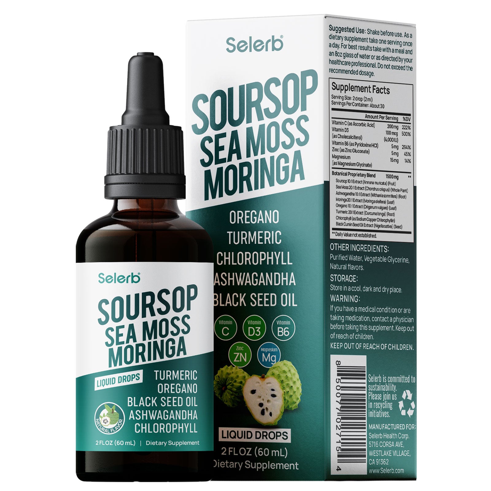 This Soursop Bitters Liquid formula delivers comprehensive plant-based and micronutrient support with 10:1 soursop extract, sea moss, ashwagandha, moringa, oregano, turmeric, chlorophyll, and black cumin seed oil—enhanced with Vitamin C, Vitamin D3, Vitamin B6, zinc, and magnesium for balanced daily wellness support