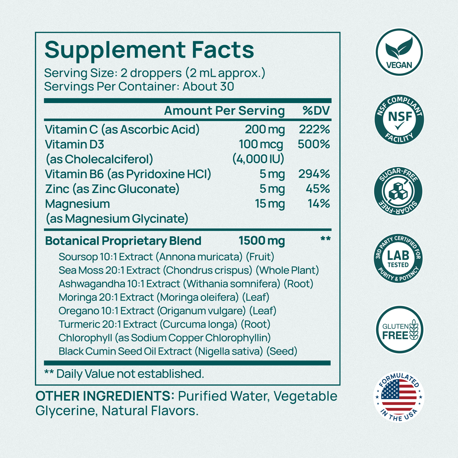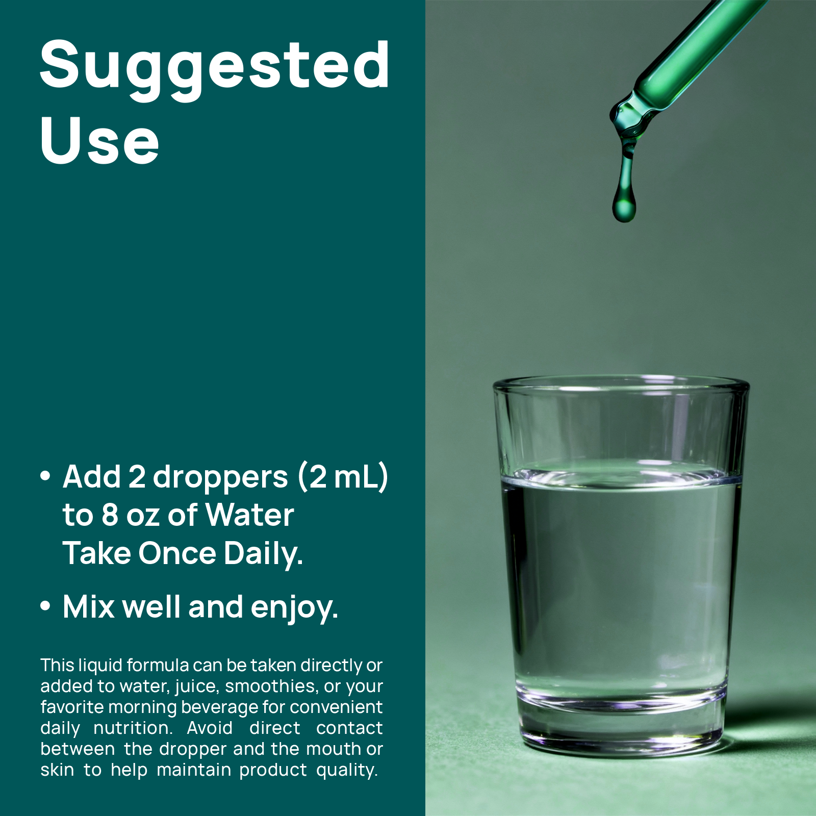Adults take 2 droppers (approximately 2 mL) daily, preferably in the morning or as part of your regular wellness routine.